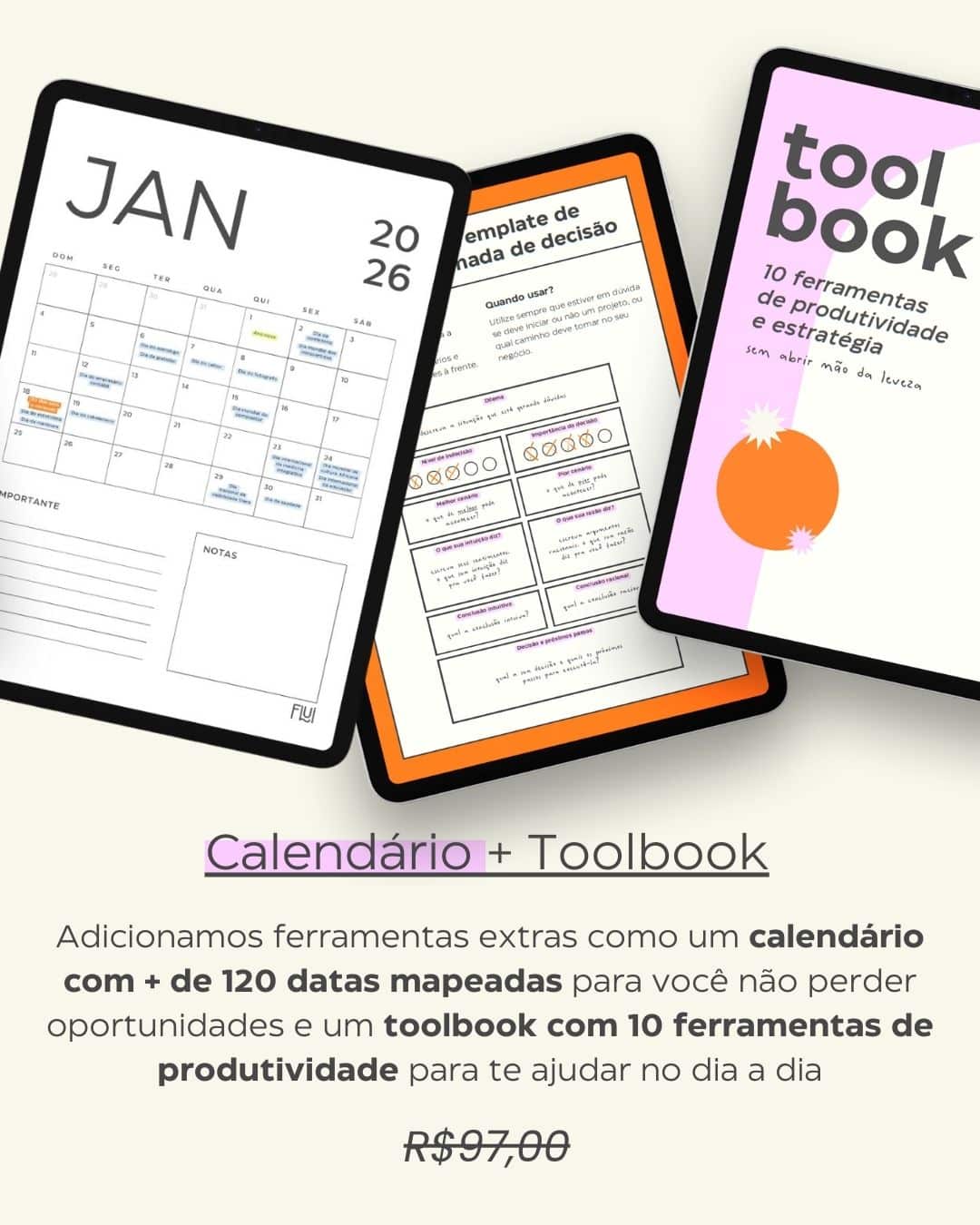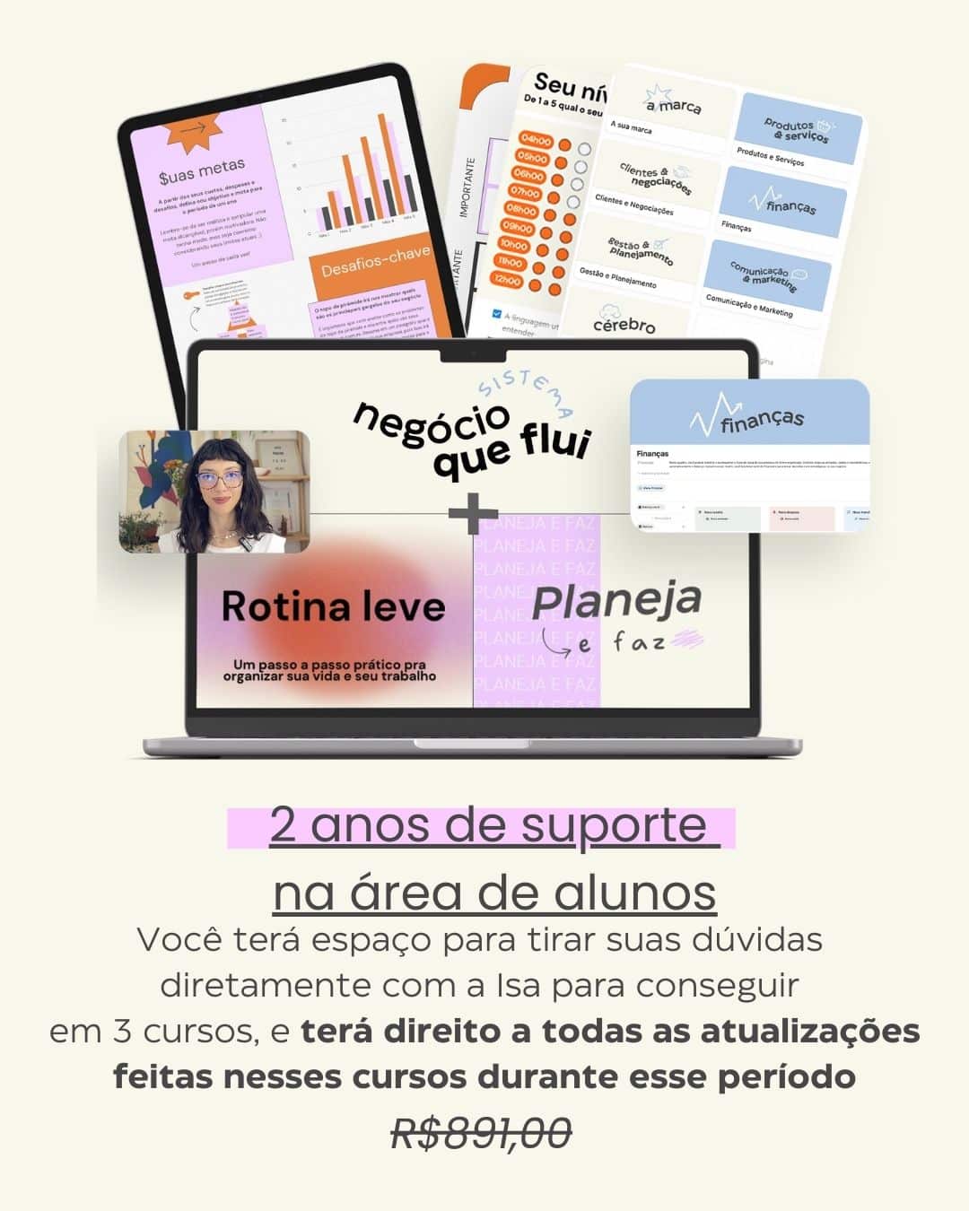 O Combo com o Rotina leve + Planeja e Faz + Sistema Negóocio que Flui é pra quem sente que o dia não rende, que o negócio está solto, que falta clareza e estrutura sem aquele peso da autocobrança e da produtividade tóxica.