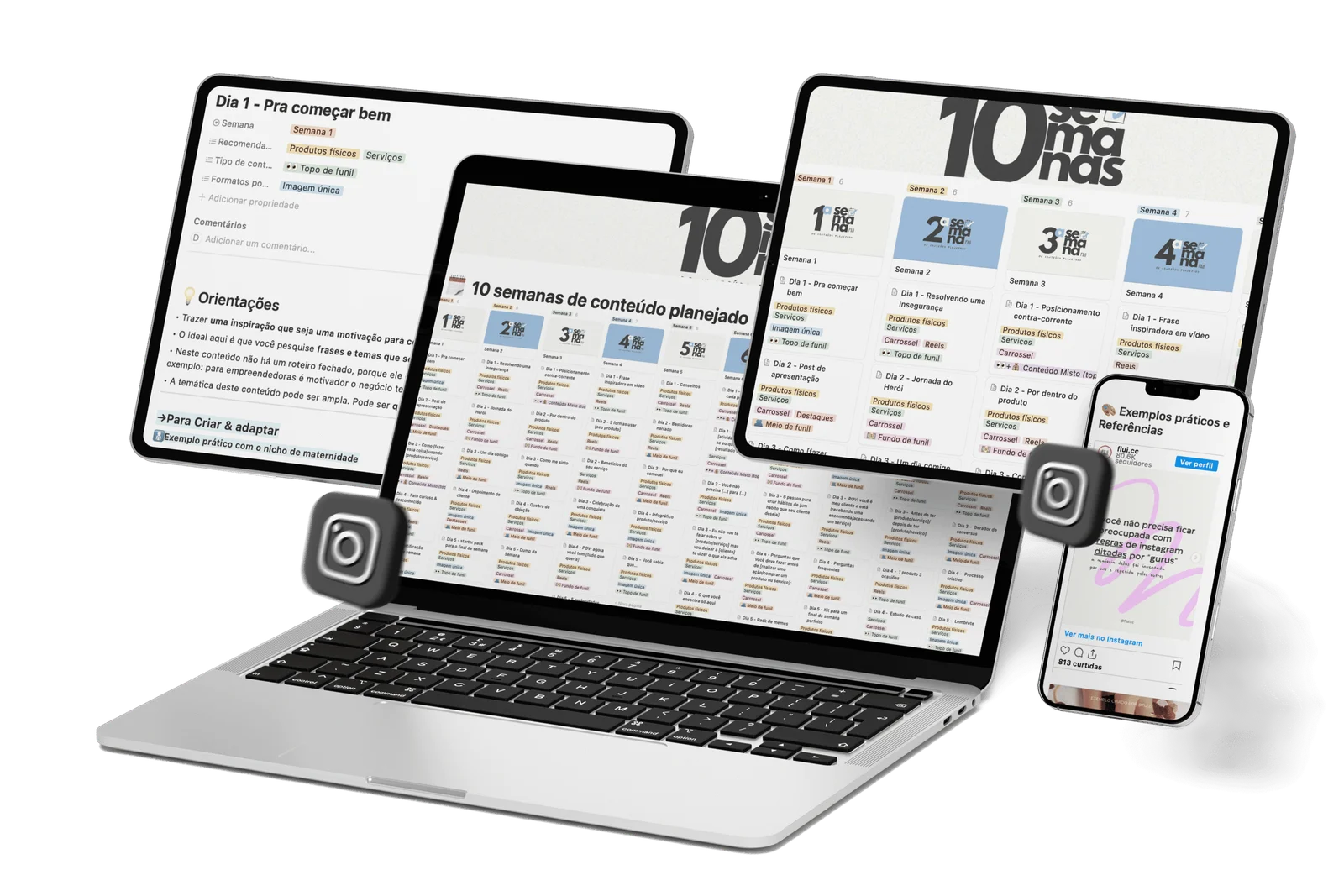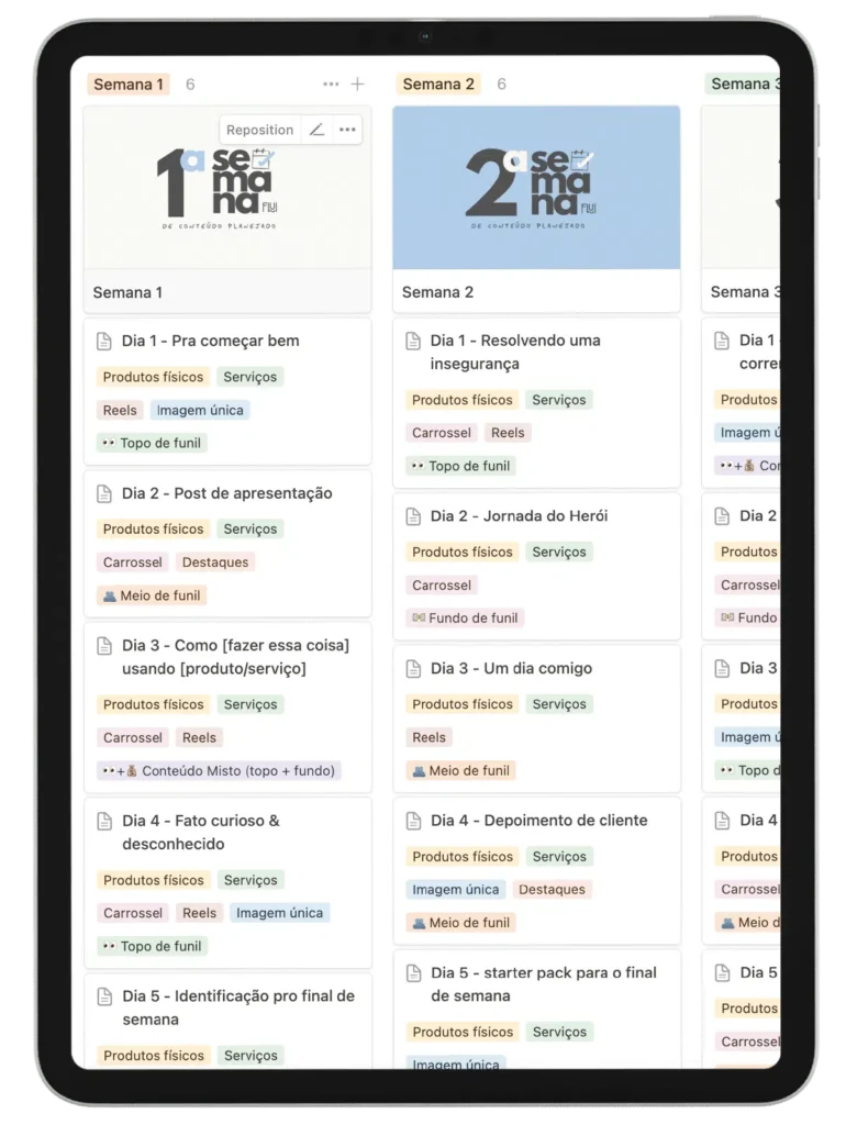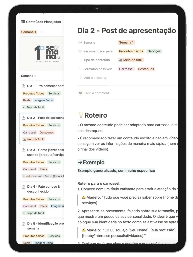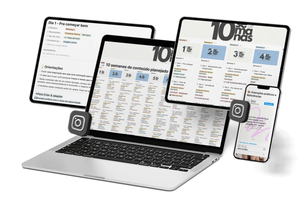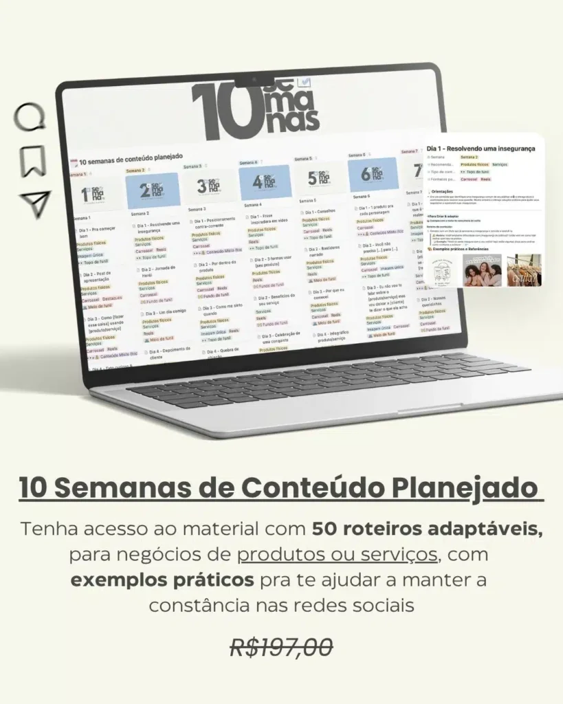 Você terá acesso a um notion com conteúdos de topo, meio e fundo de funil – com roteiros completos, exemplos práticos e legendas. Tudo pronto pra adaptar e postar, sem perder tempo!