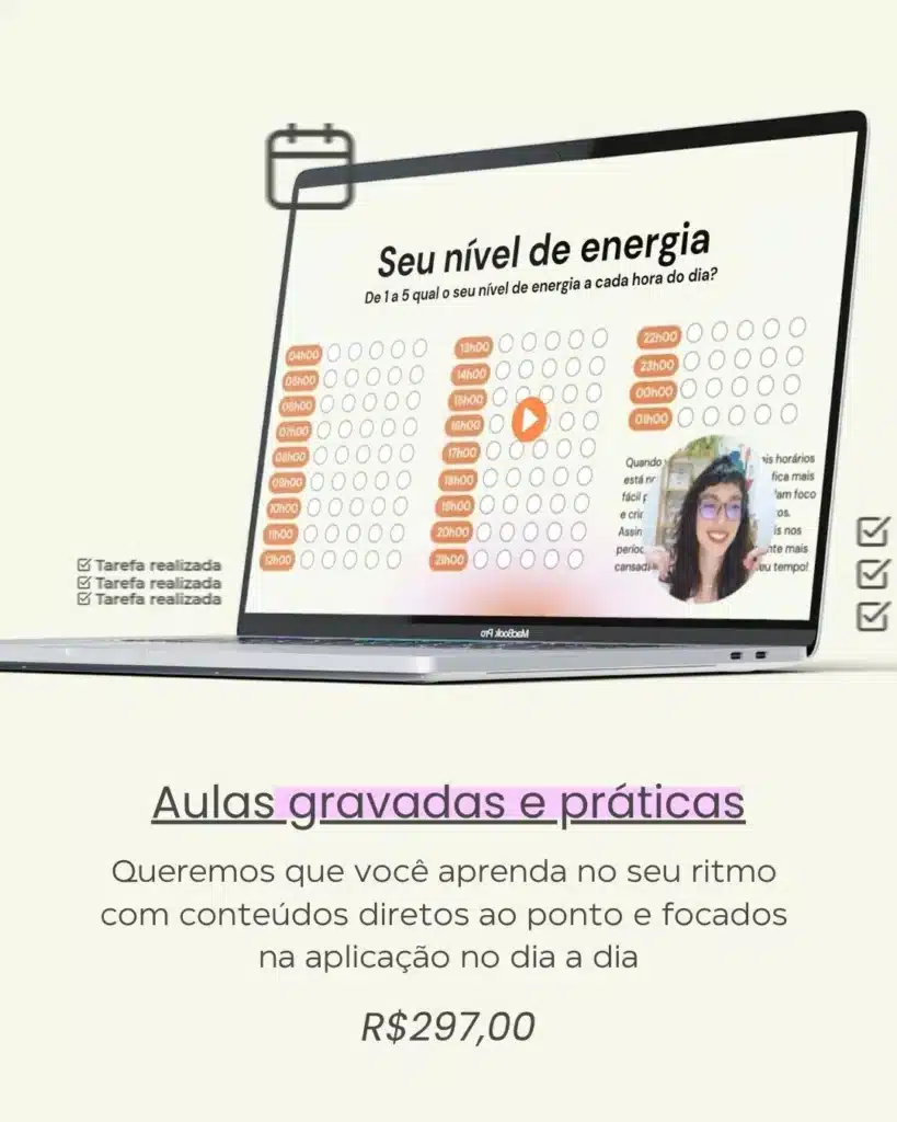 Você vai mapear sua rotina atual, identificar os obstáculos e os momentos de maior produtividade. Com isso, conseguirá criar uma rotina personalizada, que se adapta à sua realidade e ao seu ritmo, sem precisar seguir regras rígidas ou se sentir pressionada.