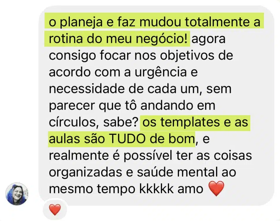 Se você quer mais organização no dia a dia e um planejamento sólido para o seu negócio, te recomendo fazer os dois cursos! E para tornar isso viável, disponibilizamos uma condição especial para o Planeja e Faz para aqueles que adquirirem o Rotina Leve.