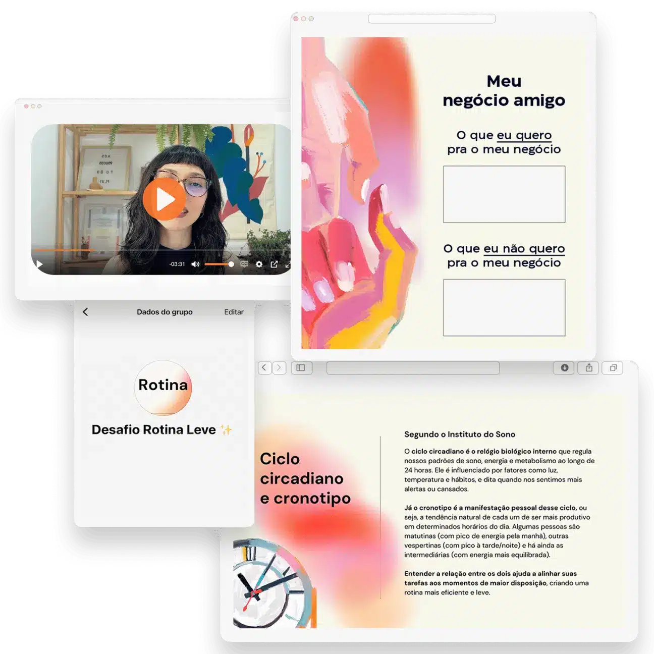 Os dois cursos têm propostas diferentes, mas eles se complementam. A imersão Rotina Leve é para quem deseja organizar o dia a dia e criar uma rotina que funcione, conciliando trabalho e vida pessoal sem sobrecarga ou culpa.