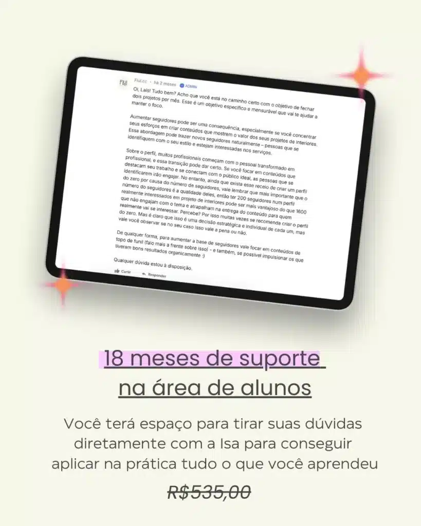 Durante 18 meses, você terá acesso ao suporte na área de membros para tirar suas dúvidas sobre o curso. Fica muito mais fácil quando a gente não está sozinha (:
