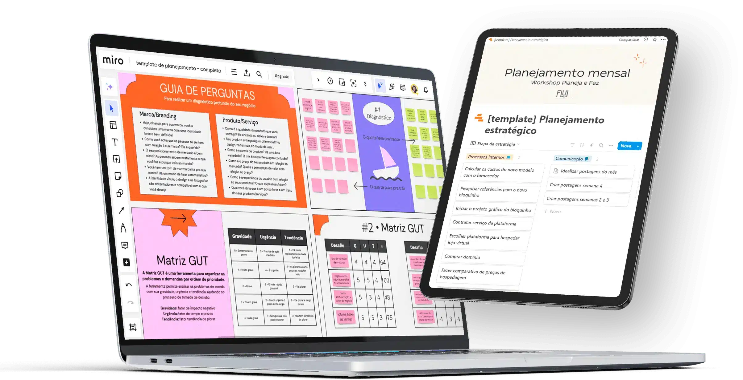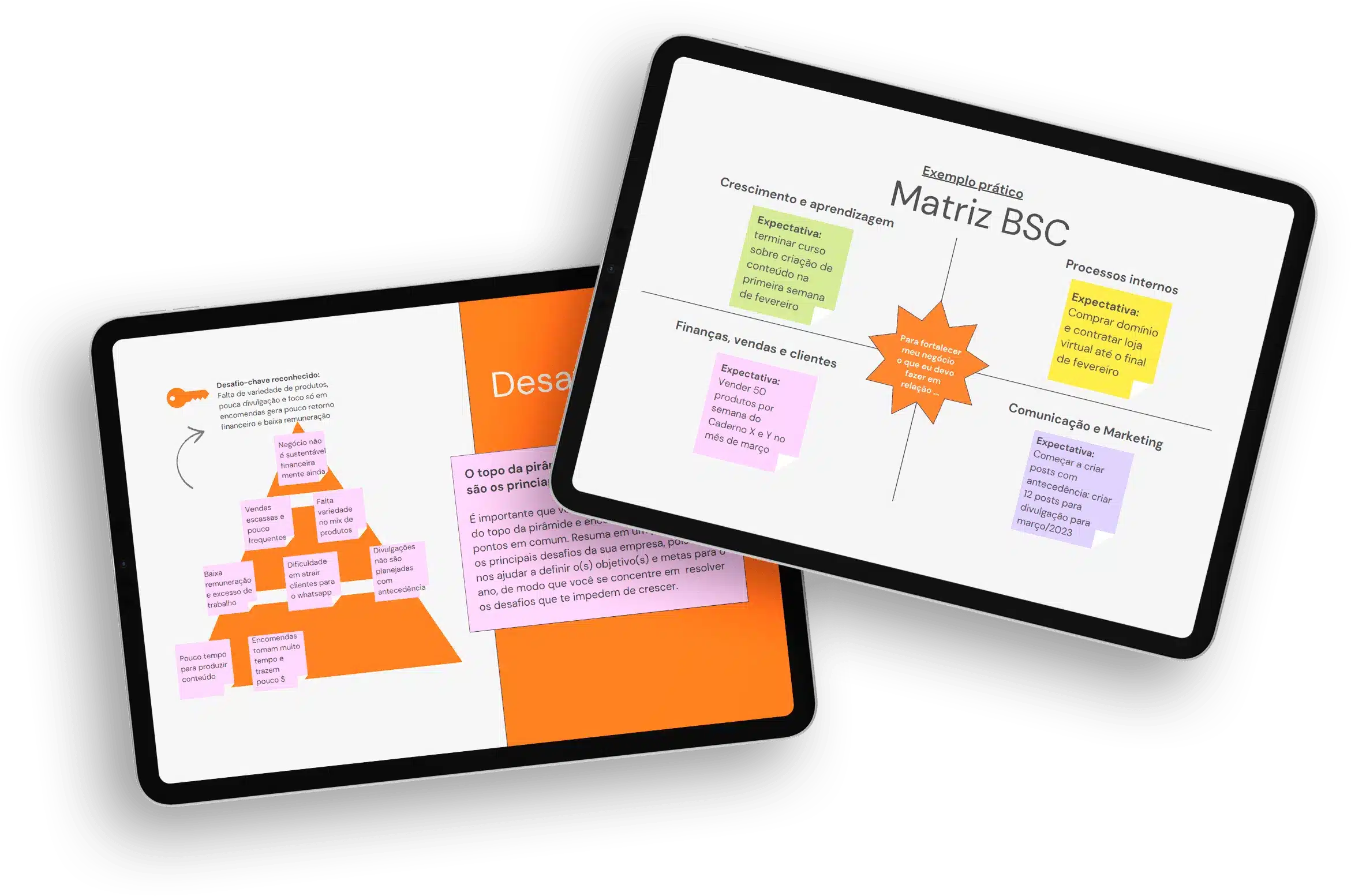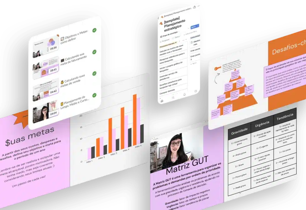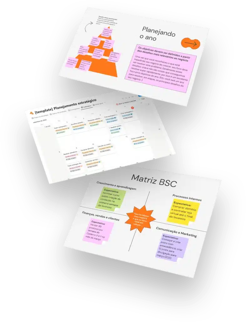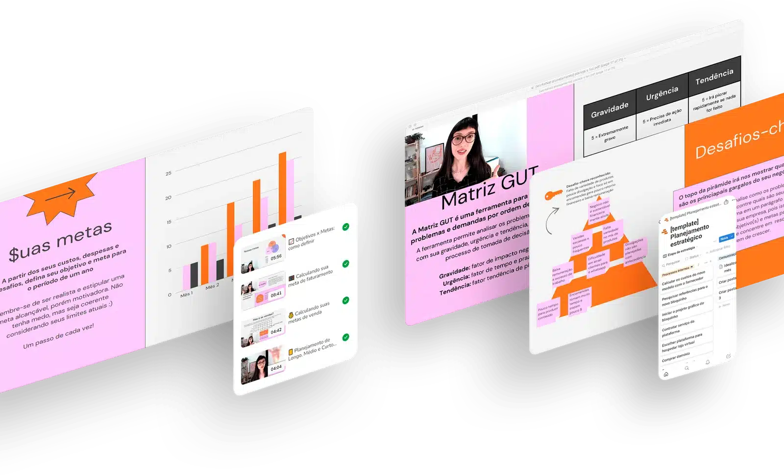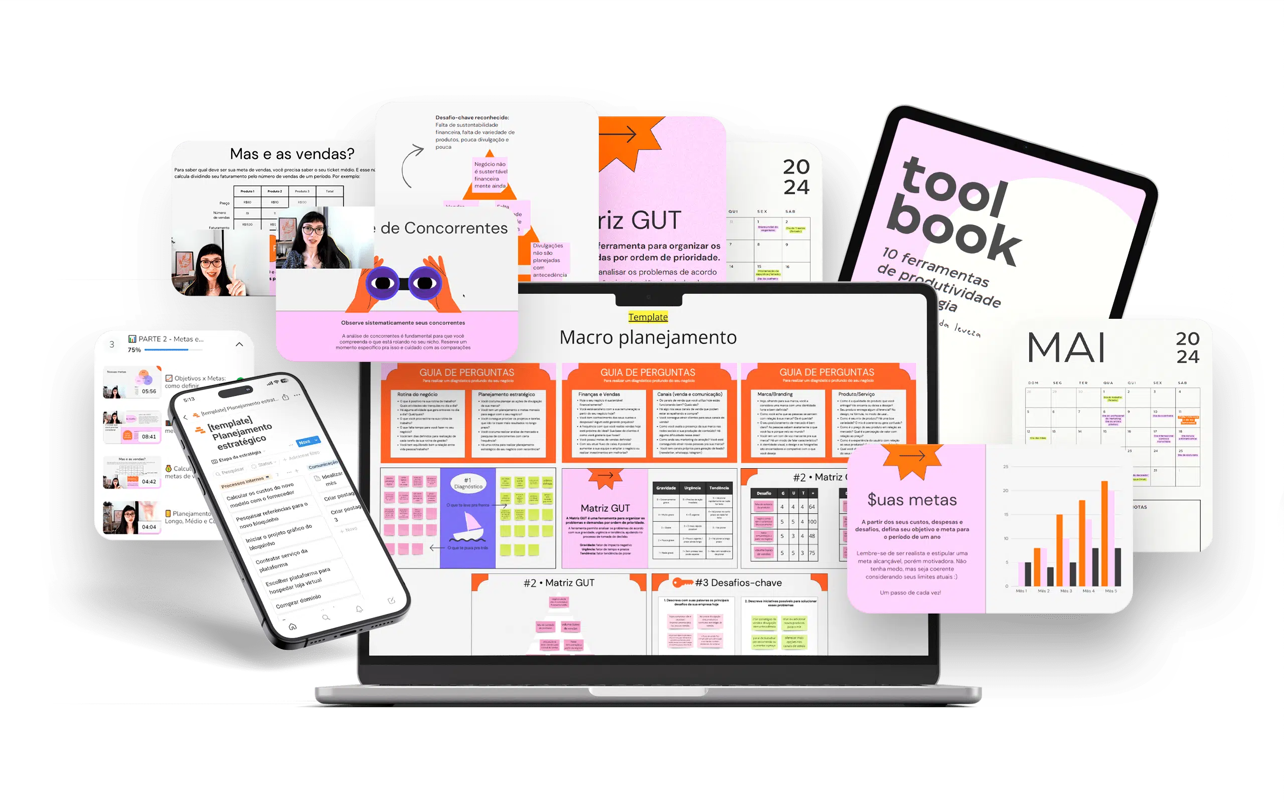 Com nosso método prático e templates prontos, você vai definir ações, metas e estratégias para tirar seus planos do papel, conseguir dar conta das suas tarefas com leveza e ver seu negócio crescer