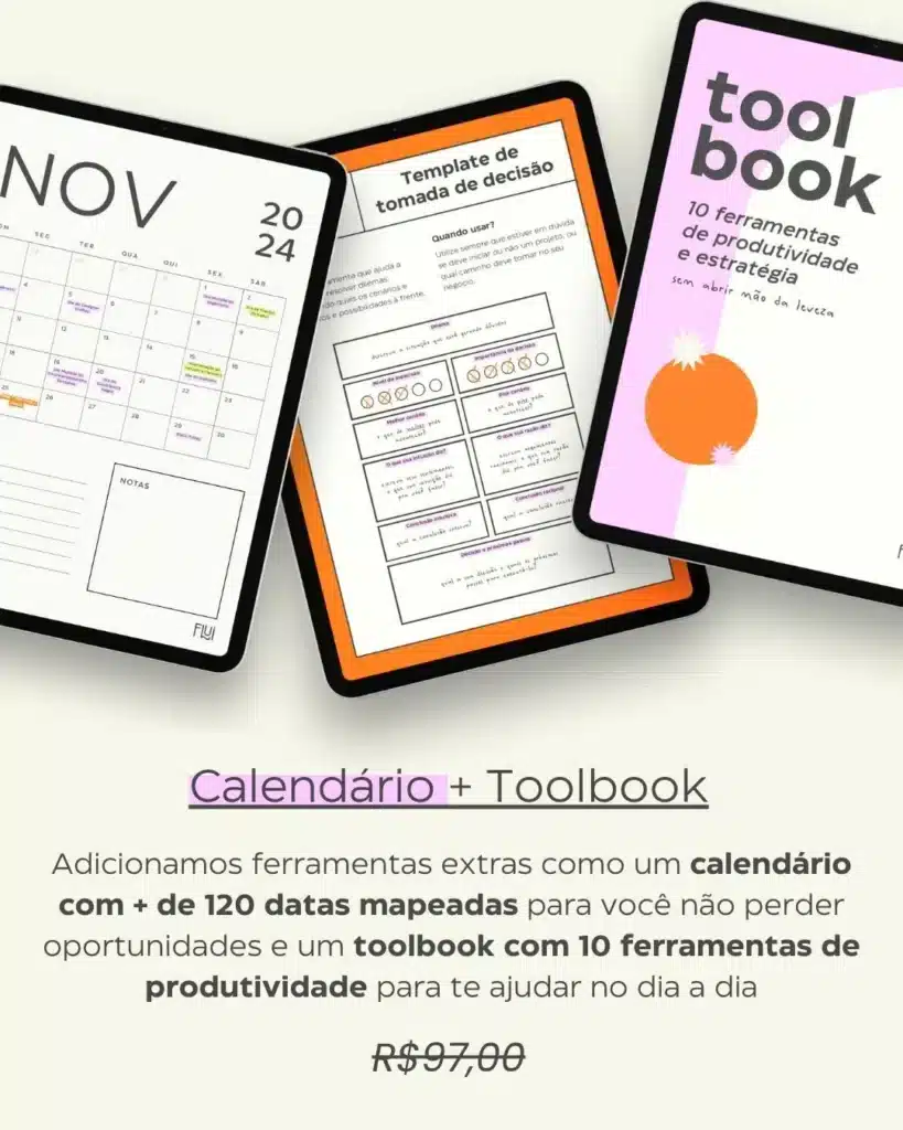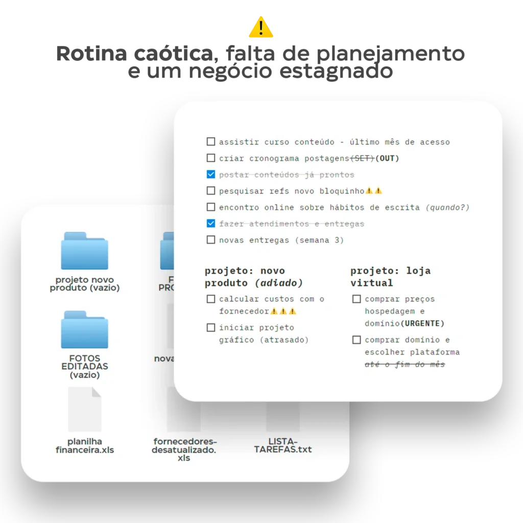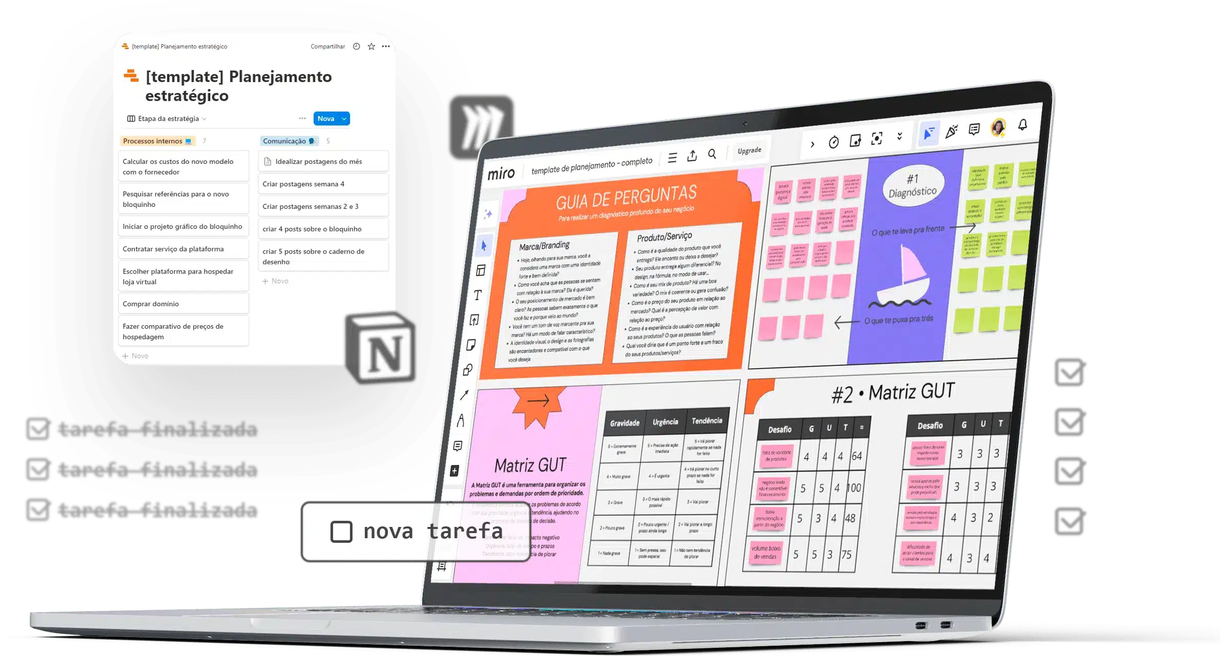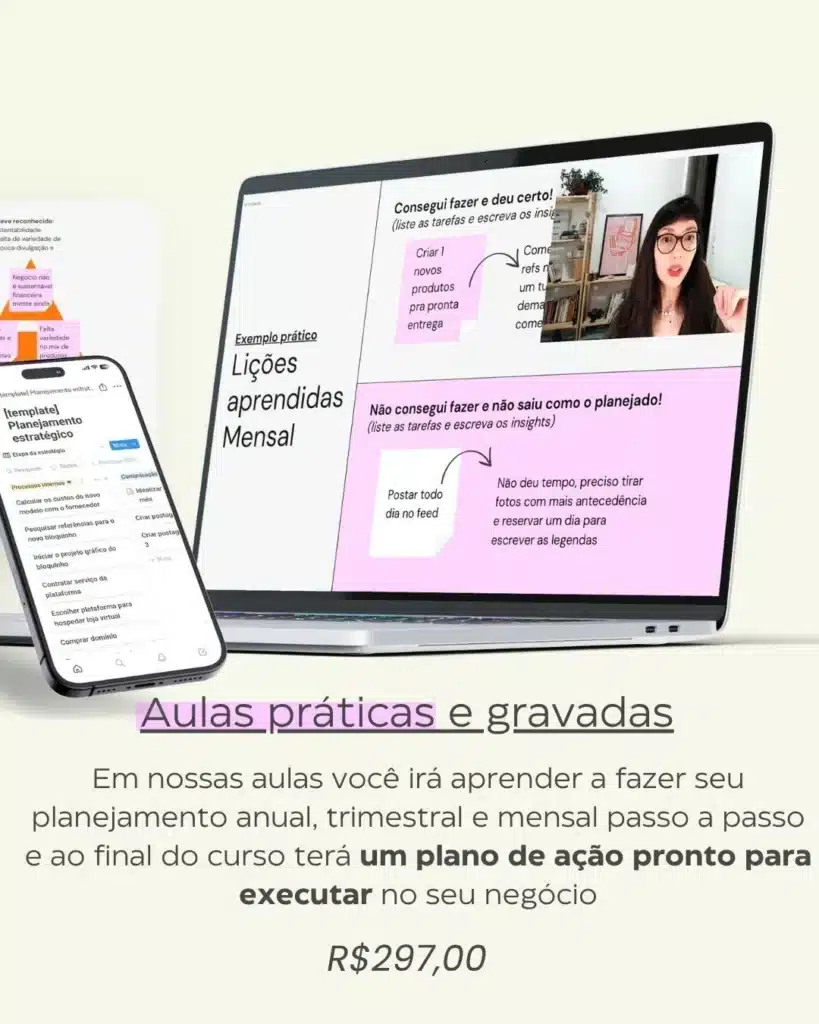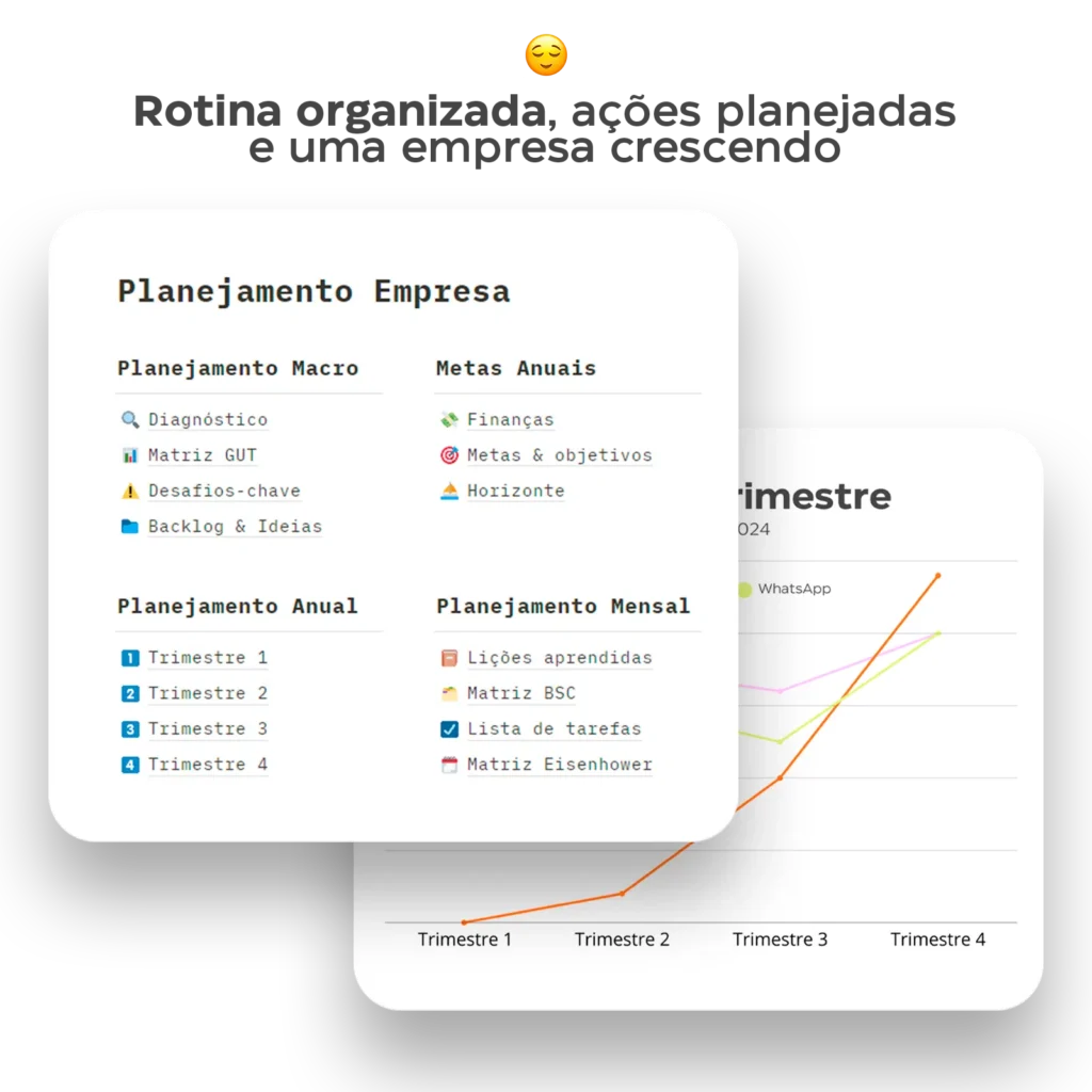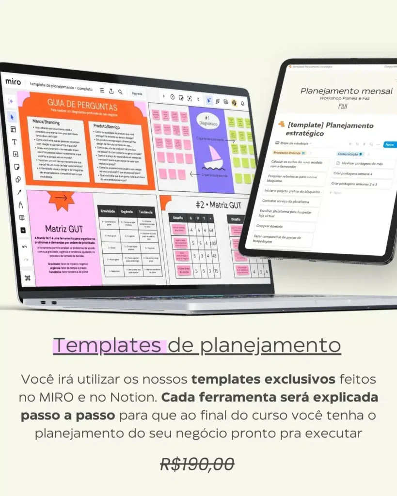 Com nosso método prático e templates prontos, você vai definir ações, metas e estratégias para tirar seus planos do papel, conseguir dar conta das suas tarefas com leveza e ver seu negócio crescer