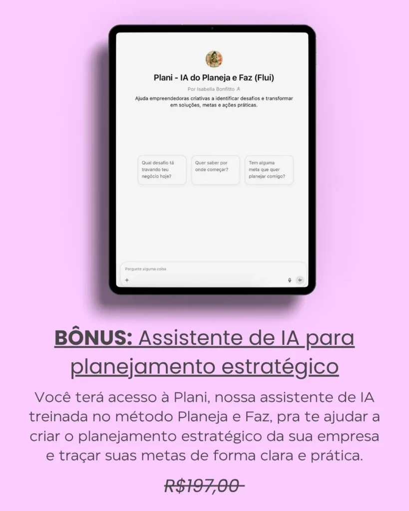Não. O Planeja e Faz é um curso de planejamento estratégico e ele vai te ajudar a planejar o futuro do seu negócio, definir suas metas de venda e faturamento e organizar sua rotina pra conseguir colocartudo em prática através de metodologias comprovadas.