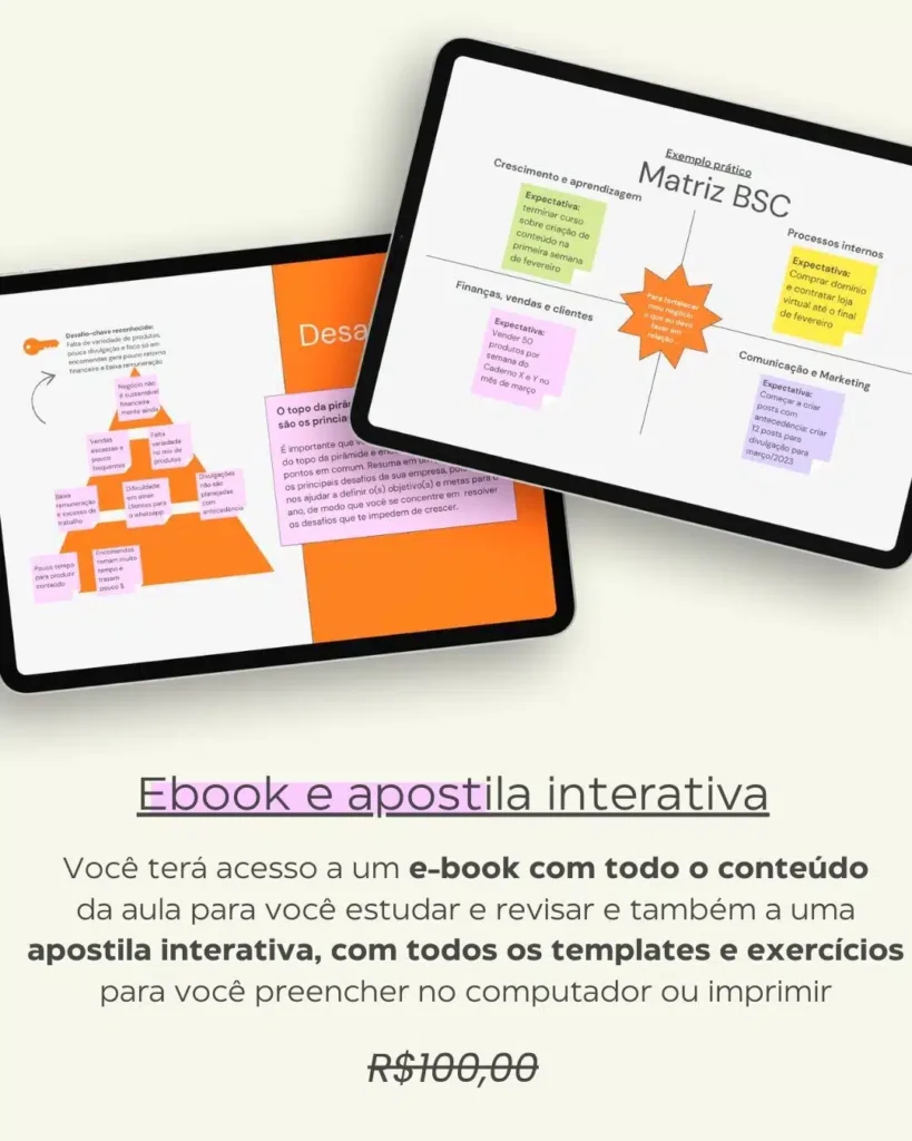 Para te oferecer uma experiência de aprendizado completo, você terá acesso a um e-book com todo o conteúdo da aula, para consultar sempre que quiser. E também à uma apostila interativa, com todos os templates, caso prefira preencher no computador ou imprimir.