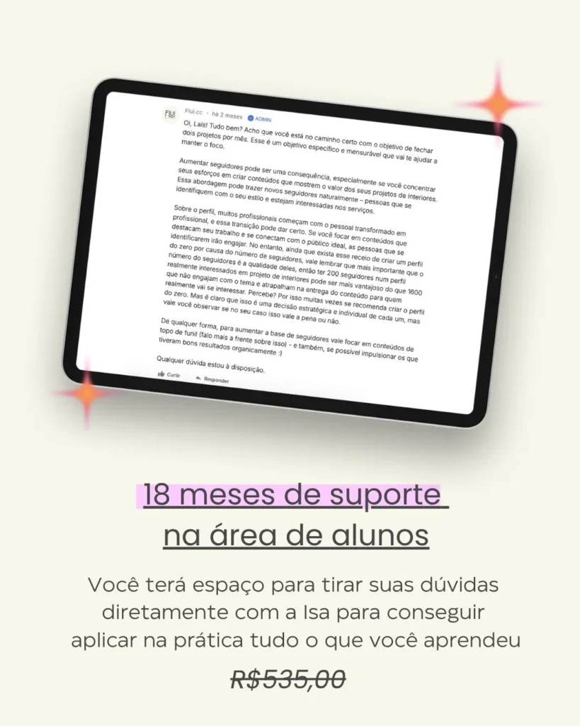 18 meses de acesso à área do aluno, onde você pode tirar todas as suas dúvidas com um suporte personalizado contando com o apoio de quem entende do assunto e quer ver seu negócio crescer.