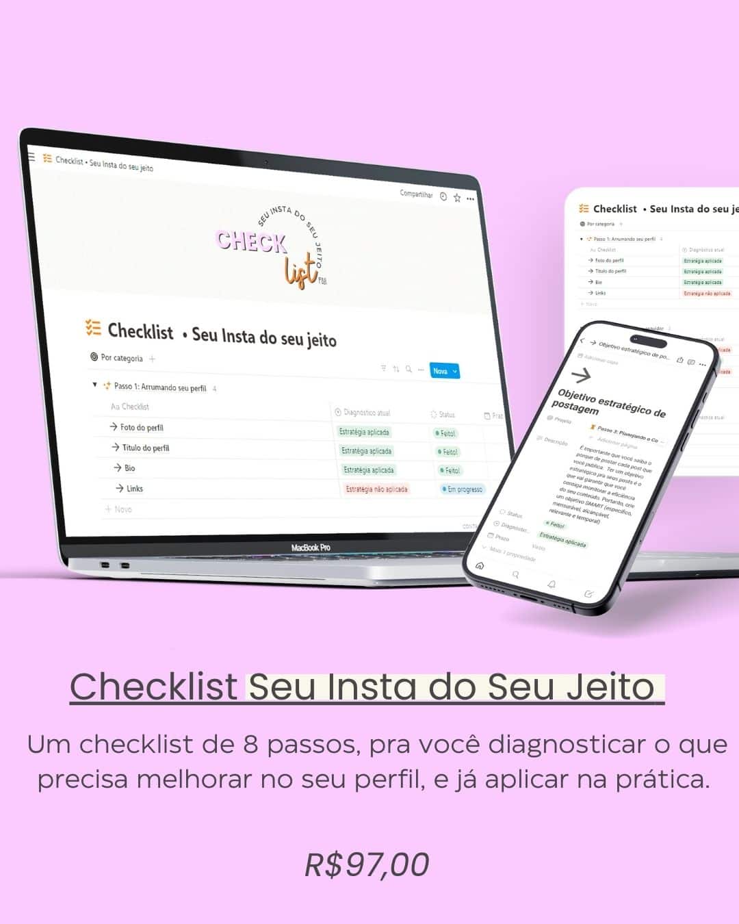 Imagina deixar seu insta totalmente profissional em poucos passos? Com esse checklist prático você consegue transformar seu insta num canal estratégico pra sua marca, seguindo tarefas simples.