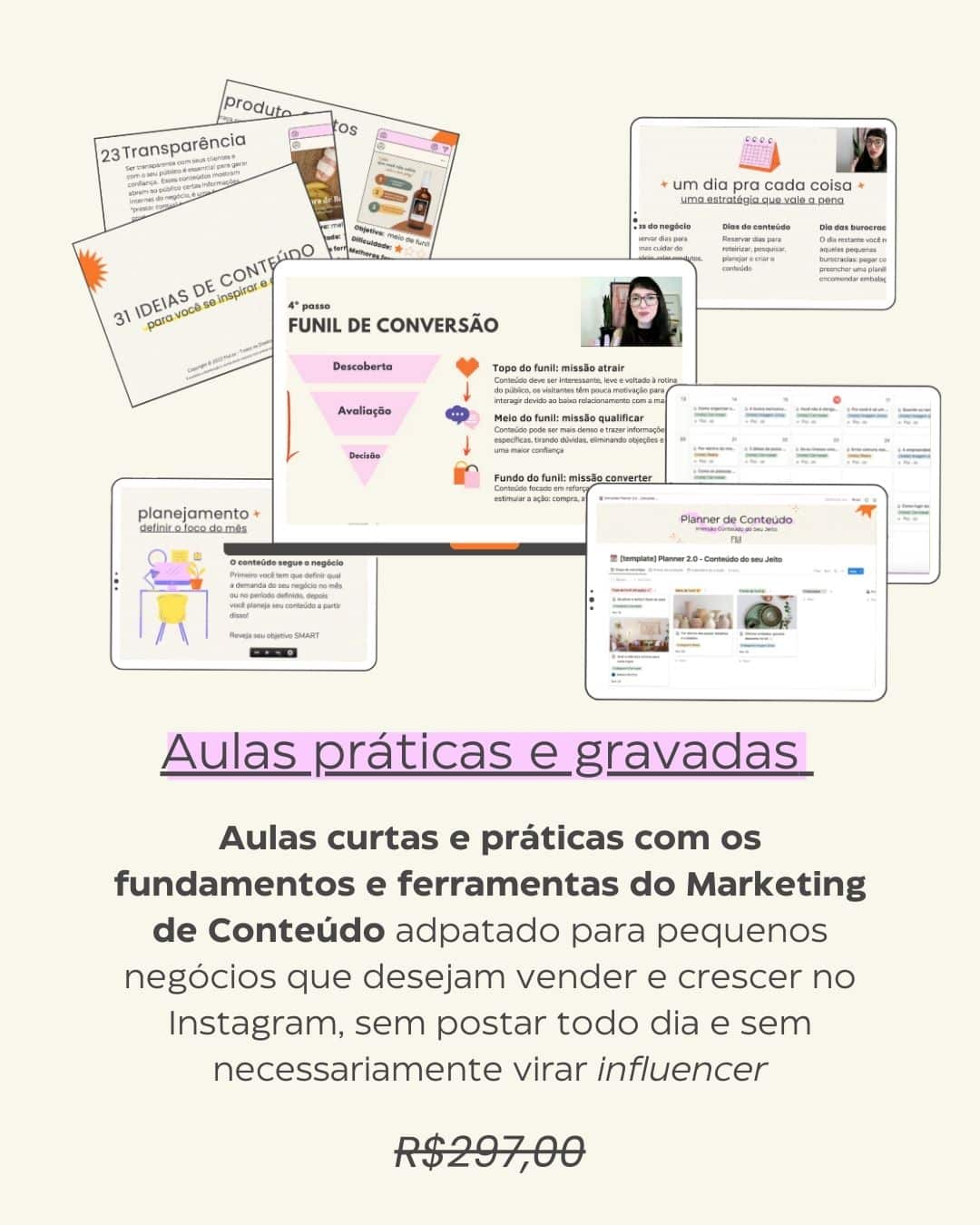Curso completo de marketing de conteúdo pro Instagram: planejamento, entendimento de público, linha editorial que faz sentido, conteúdos para atrair, gerar confiaça e vender, exploração de todos os formatos e análise de conteúdo para crescer 🙂